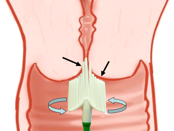 A longer bristles of the cervix sampling brush is placed into the external os and rotated around to sweep and collect cells from the cervix.