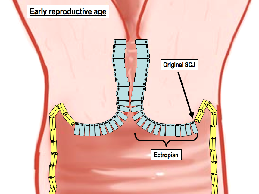 At this age, the columnar epithelium become exposed onto the ectocervix. The ectropian does not always occur symmetrically. The SCJ now lies on the ectocervix, rendering very few squamous cells on the cervix (now, they are mostly found on the vaginal wall).