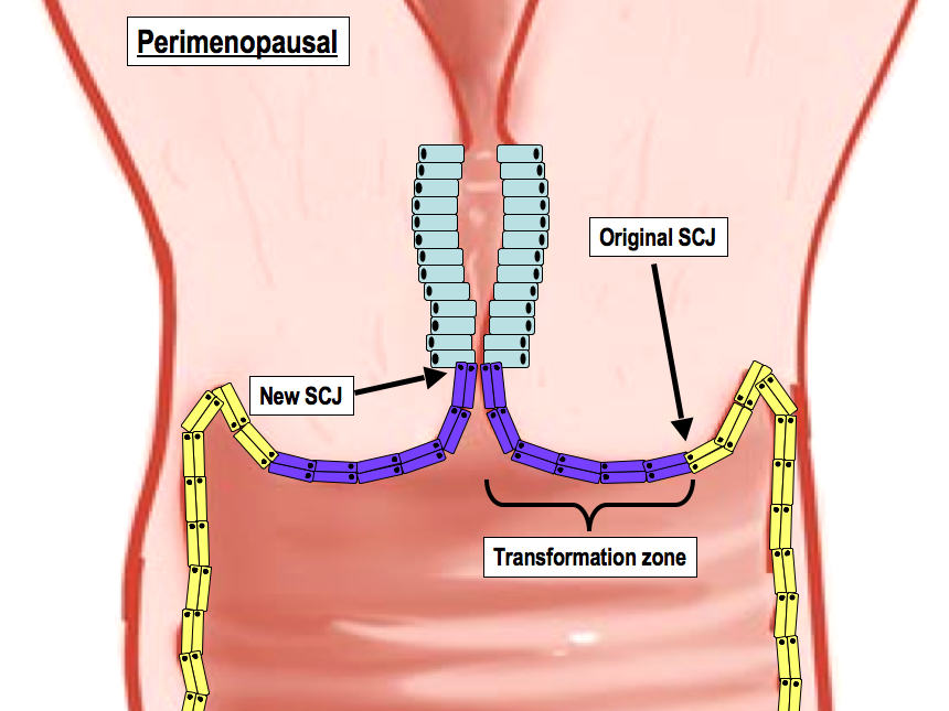 The transformation zone begins to migrate into the endocervical canal. Both SCJs also migrate in this direction.