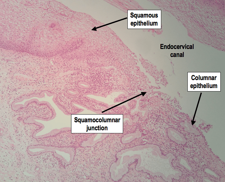 High power H&E showing the squamocolumnar junction, where the squamous and columnar epithelium meet.