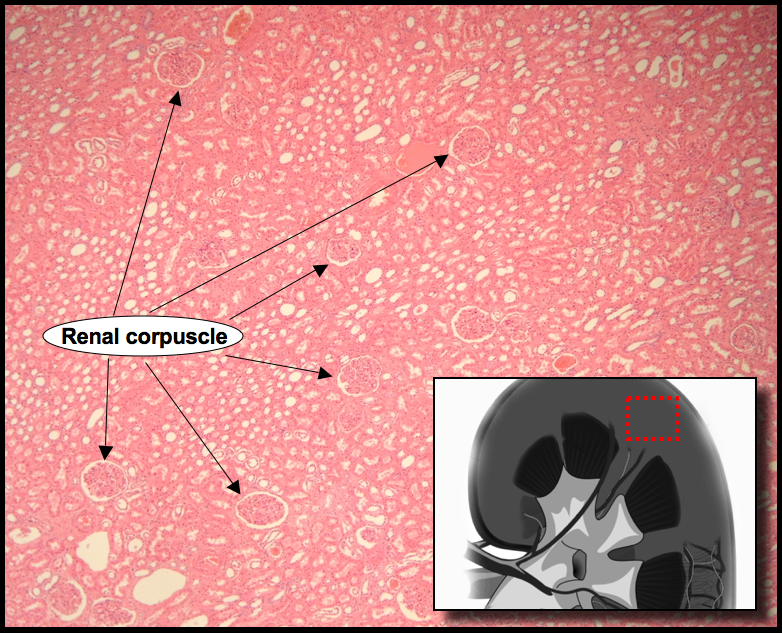 Renal corpuscles (also known as the Malpighian corpuscles) measure approximately 300µm (0.3mm) in diameter. These structures look like scraggy balls of string captured inside irregular bubbles, but what they really are are intricate micro-filtering machines that consist of a Bowman’s capsule and a glomerulus. These renal corpuscles, together with the tubules that run in continuation from them, are collectively known as a nephron (see first image).