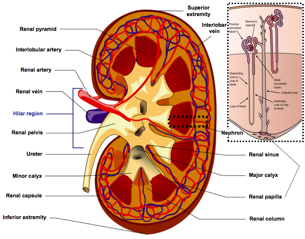 Structures of the kidney. Inset: a closer look at the black dotty outlined region: the nephron (click to embiggen). Images are adapted from wikicommons: Main & Inset.