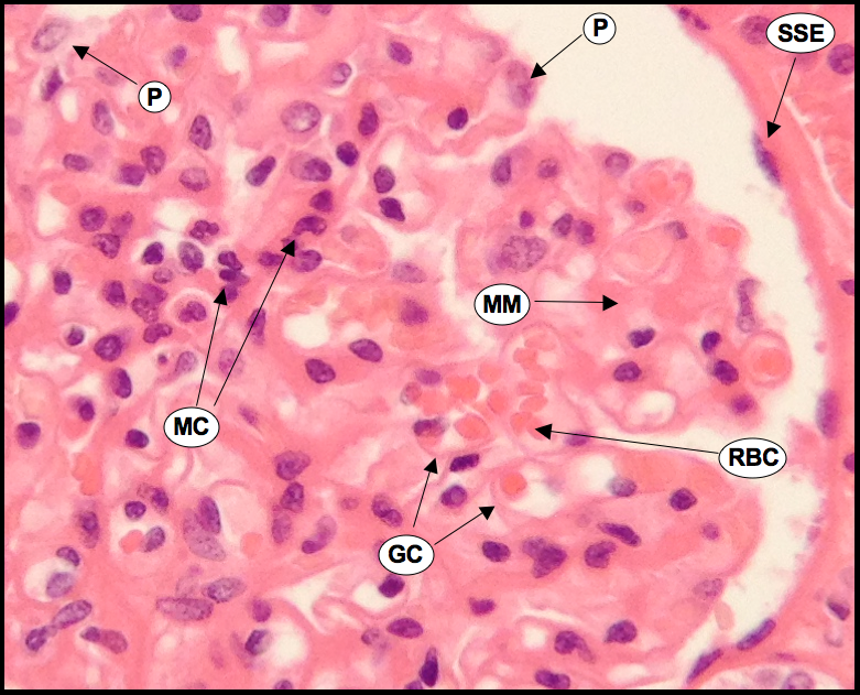 A high power H&E of the renal corpuscle. Key: P = podocyte, SSE = simple squamous epithelium, MC = mesangial cell, MM = mesangial matrix. GC = glomerular capillary, RBC = red blood cell