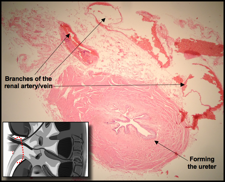 A (little bit shoddy) low power H&E of the renal hilar region. Inset: the red outline shows the site that corresponds to the H&E