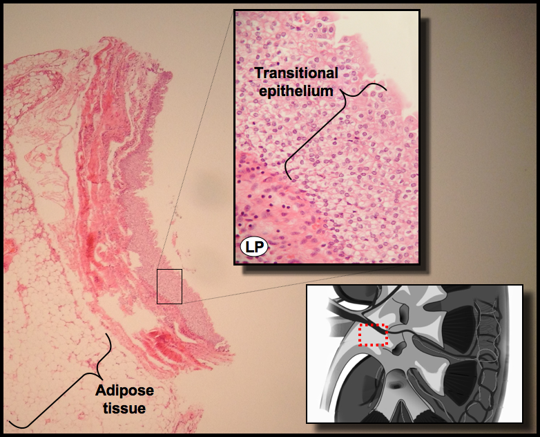 A low power H&E of the renal pelvis, and a high power H&E of its transitional epithelium. LP = lamina propria. B&W inset: the red outline shows the site that corresponds to the H&E