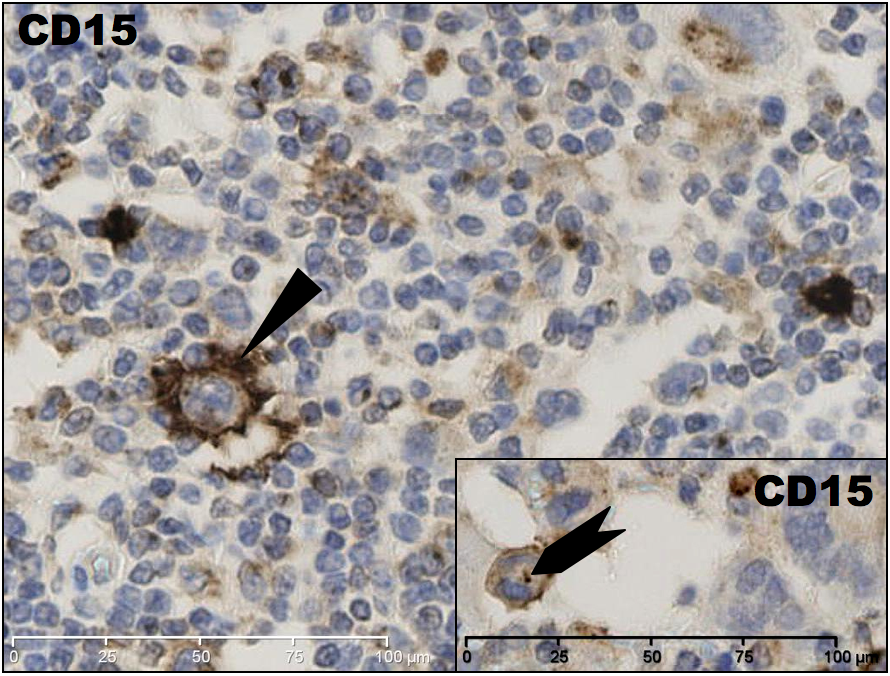 CD15 stains granulocytes and most monocytes, but it can also be used to confirm Reed-Sternberg cells with the same characteristic staining pattern as CD30: