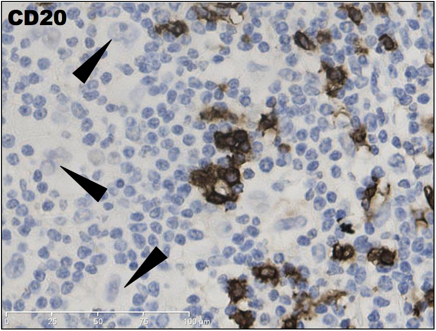 High magnification IHC CD20 demonstrating CD20-negative large irregular cells (arrowheads).