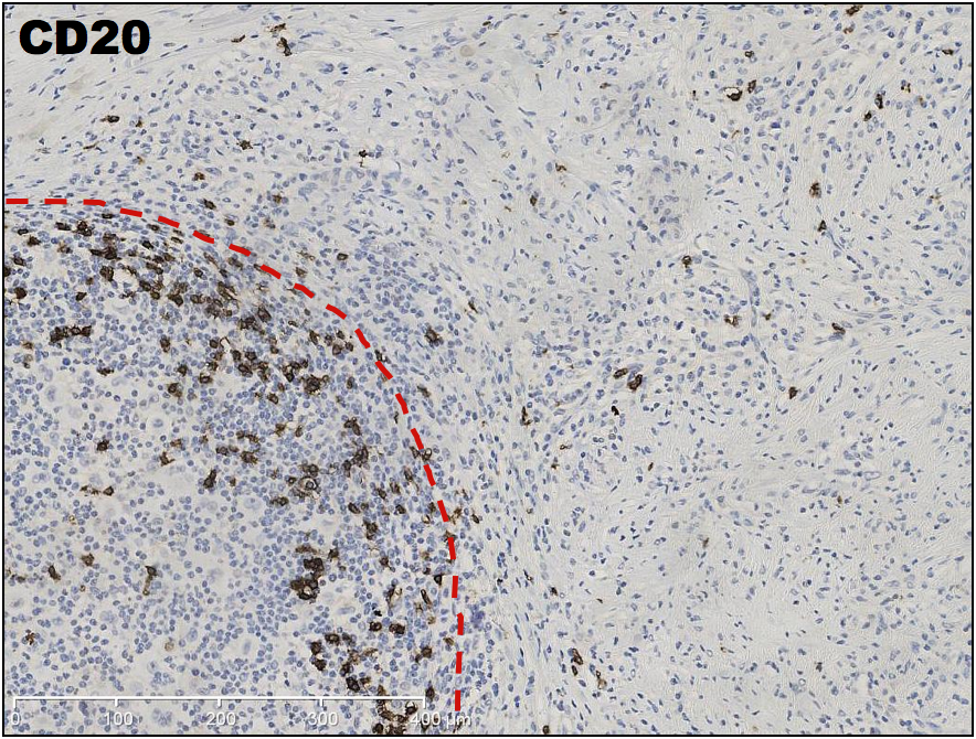 Next up, the sample is stained with CD20 to identify cells of the B-cell lineage:
