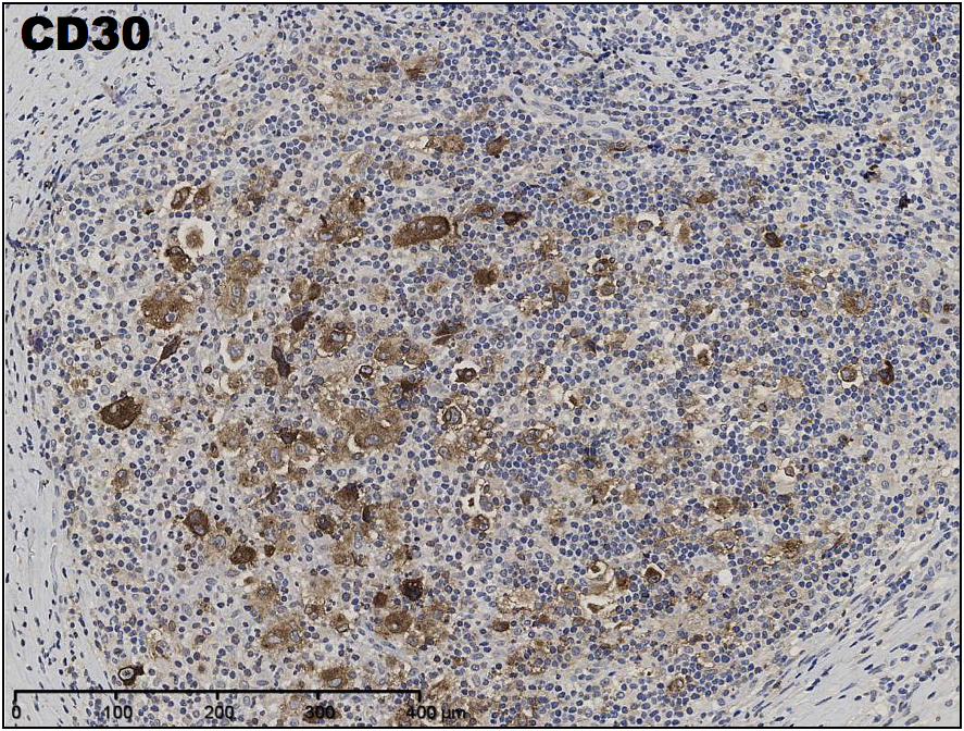 Medium magnification IHC CD30 demonstrating large cell positivity.