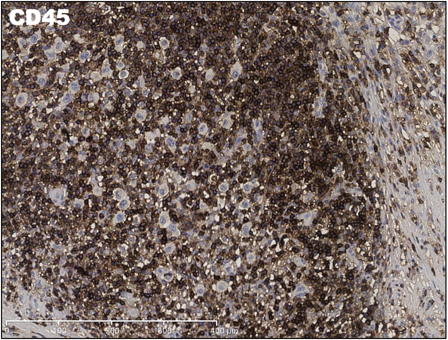 In this particular case study, the pathologist used five different IHC antibodies to highlight different cell lineages, and these were CD3 (CD stands for “cluster of differentiation”), CD20, CD45, CD30 and CD15.