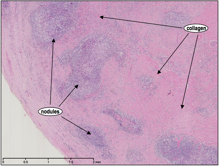 A low magnification H&E showing dense bands of collagen causing effacement of lymph node architecture, and formation of distinct nodules.