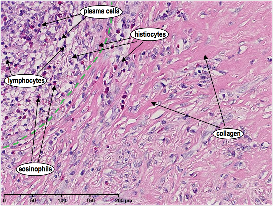 What can also be seen in the above image is the mixture of different cell types within the nodule; small lymphocytes (small, dark staining rounded cells), plasma cells (eccentric nucleus), eosinophils (dark pink cells) and pale histiocytes (vary in appearance). At this stage of the diagnosis, the pathologist would know that such an increased mixture of cells, particularly eosinophils, is a significant characteristic of both T-cell and Hodgkin lymphomas. [To see normal lymph node cell mixtures, see here].