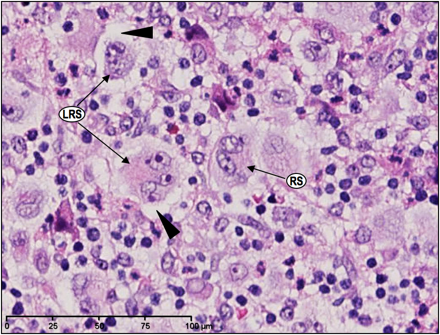 High magnification H&E demonstrating more clearly the binucleated owl-face (see!) Reed-Sternberg (RS) cells and lacunar Reed-Sternberg (LRS) cells with their lacunae (arrowhead).