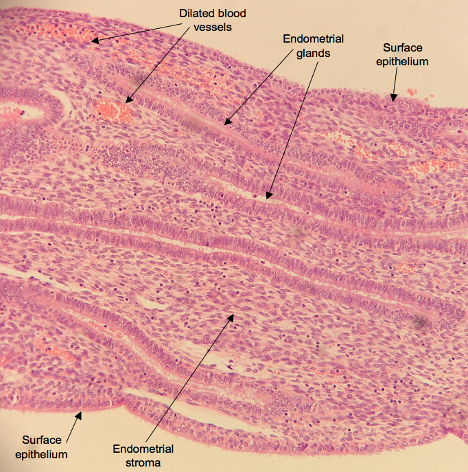 The secretory phase lasts approximately 13 days and, during this time, the endometrium is now preparing for the implantation of an embryo. The glands start to appear like deflated balloons or “saw-toothed”, the glandular epithelium become vacuolated as they begin to accumulate glycogen, and the lumen becomes filled with glycogen/glycoprotein secretions. The surrounding blood vessels become larger, and the lamina propria becomes even more oedematous.