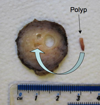 Endometrial polyps can occur in a wide range of sizes. I recently dissected a uterus that contained a very tiny endometrial polyp lodged within the endocervical canal (see photo).